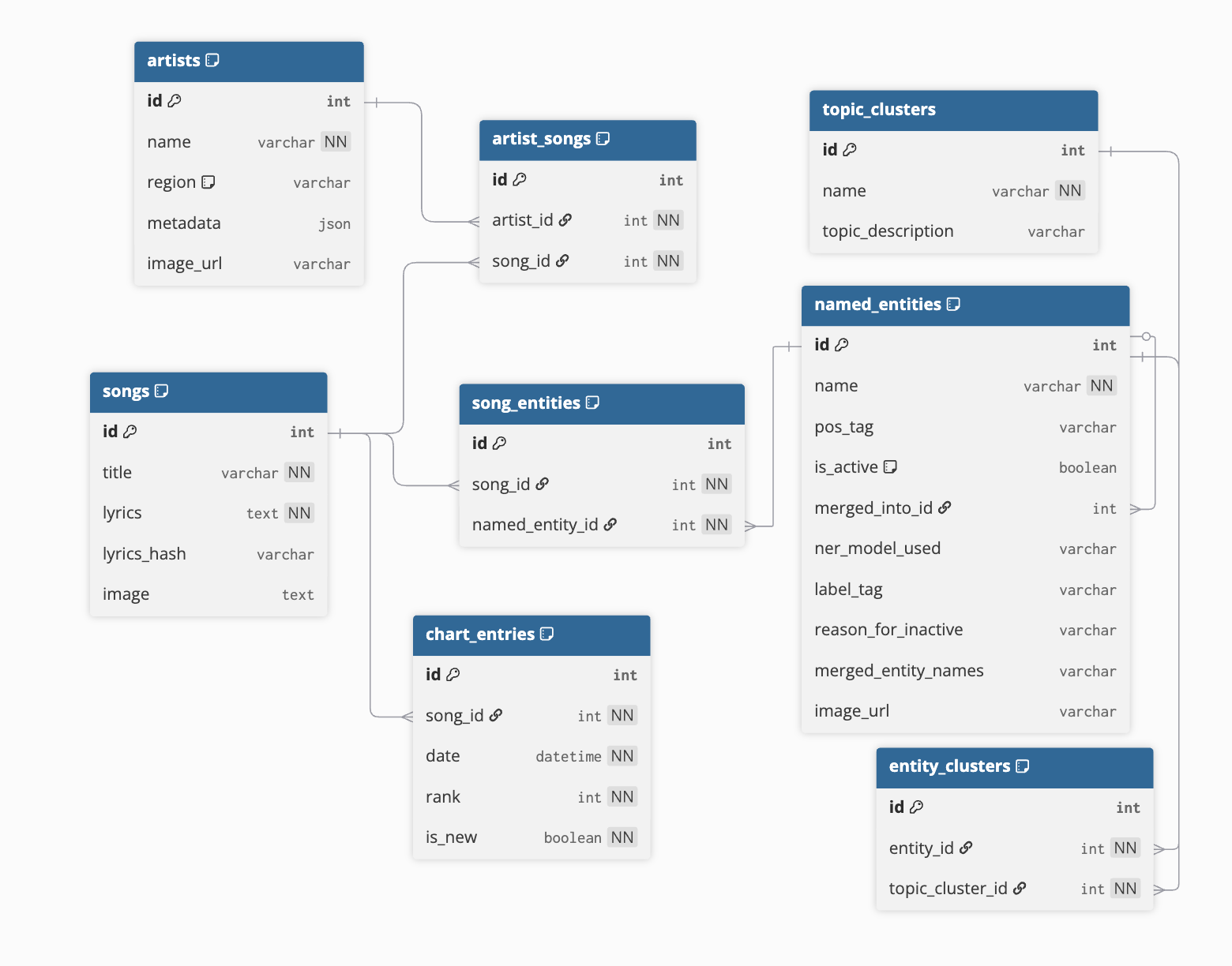 After stitching each of these components together from various databases and websites, we leveraged a few open-source machine learning models and wrote a multi-step post-processing data pipeline to takes the lyrics of each song and extract the meaningful canonical named entities that appear in that set of lyrics. We then took the output of those computational processes and bolted them on to the previously mentioned components.