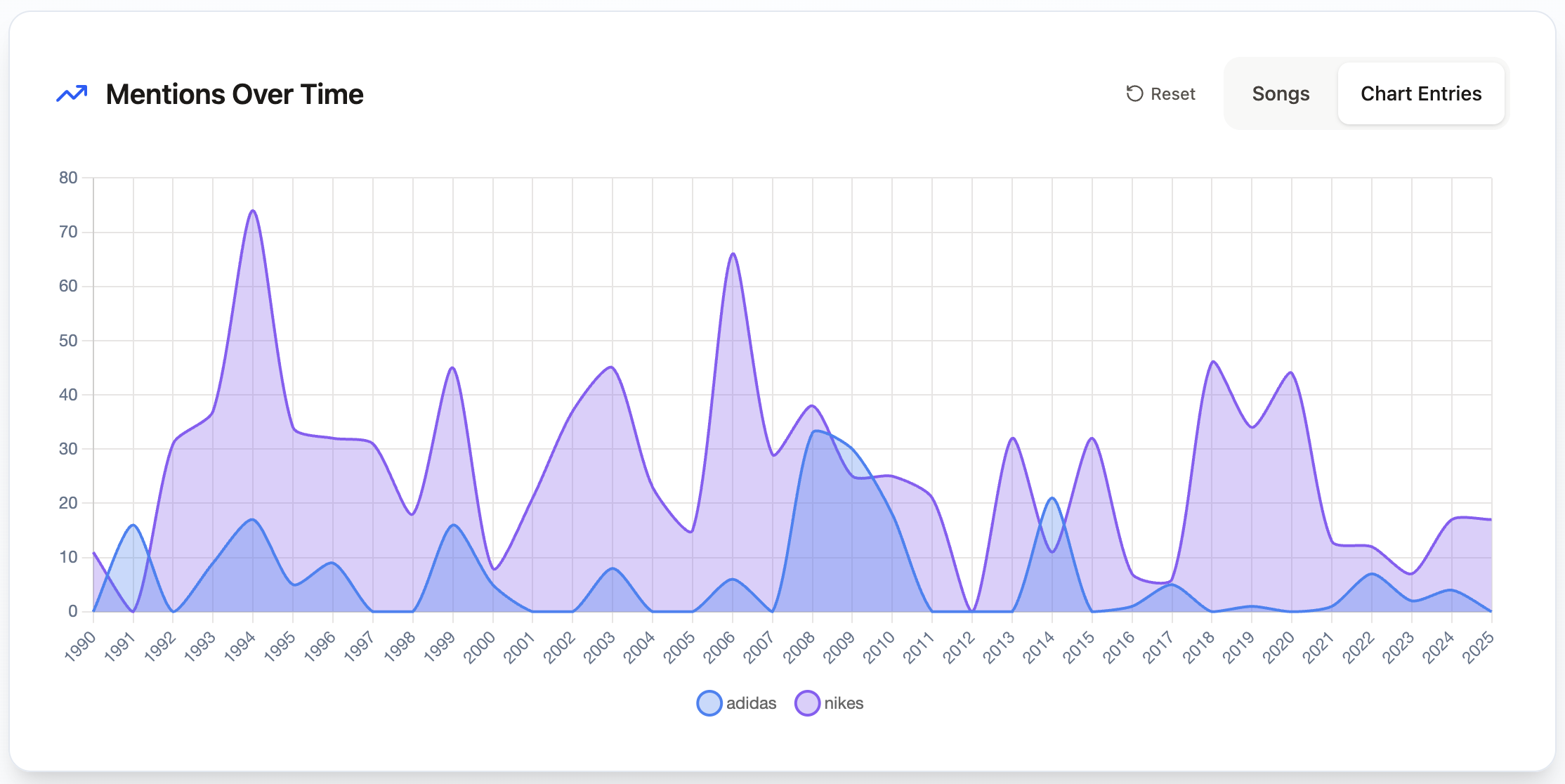 For instance, exactly when did Nike began to take up more of our collective mindshare than Adidas? We can also answer questions like: are there any regions in which musical references to Spelman, Howard, and Morehouse largely overshadow references to Princeton, Harvard, and Yale? Does rap music have a consensus on the eternally raging Jordan vs. Kobe vs. LeBron debate? How do the legacies of Obama, Clinton, and Reagan show up in our art? Is your city on the map? word?.. since when??