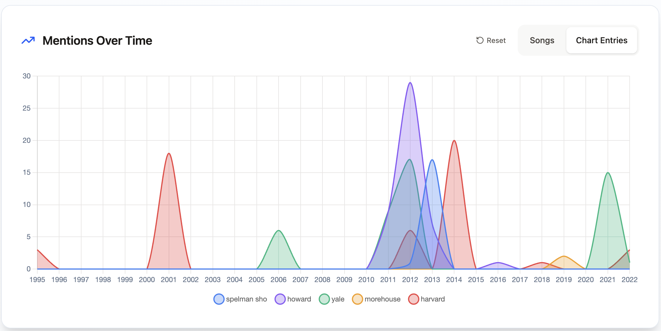 Nas has this line in Book of Rhymes where he says "My people be projects or jail never Harvard or Yale". That song didn't chart, so it's not represented in the data set, but I bet theres some interesting analysis about what those institutions represent to people in the culture and why. And perhaps more interestingly, how does that perception interact with what certain HBCUs represent?