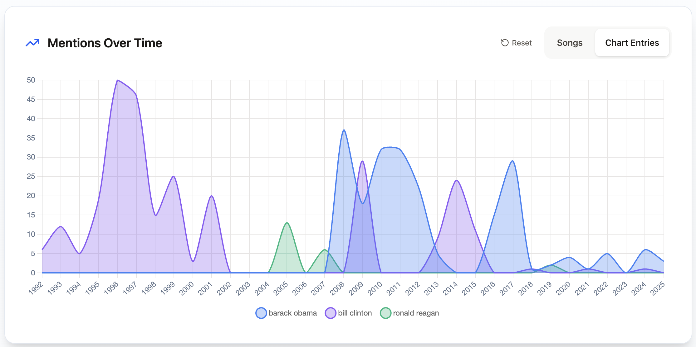 This is unexpected. I thought Obama was going to be far and away the most popular on an absolute scale. But Clinton had a generational run. I think his particular scandal was a really rich lyrical playground from which to draw references and I believe that's what is reflected in the data.