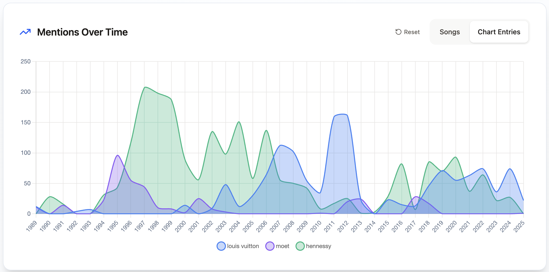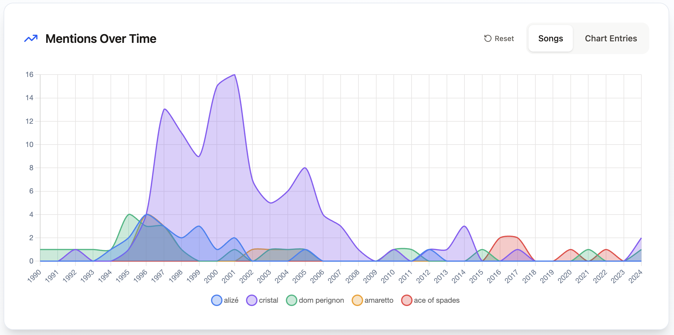 The well-documented beef between Jay-Z/Hip-Hop and Cristal took place in 2006. This data shows a gradual drop in the number of songs that mention it after 2006 which perhaps is to be expected after Jay called for a "boycott" of the brand. However, there's also a more dramatic drop after 2001, so it's hard to say if its just noise or a reflection of people buying into the anti-Cristal movement. It would be really interesting to see the breakdowns by specific artists (coming soon!).